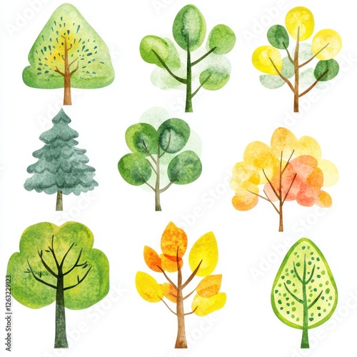 © LyceeChee, Fototapeta premium Watercolor Illustrations Of Nine Different Types Of Trees