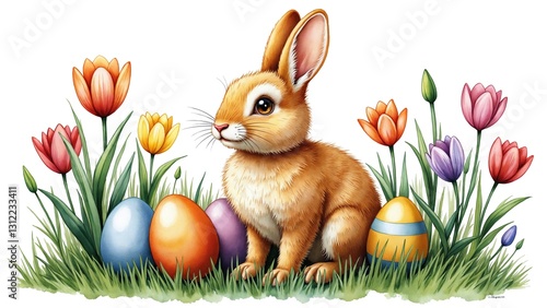 Fototapeta premium Watercolor image of easter eggs between flowers in the grass