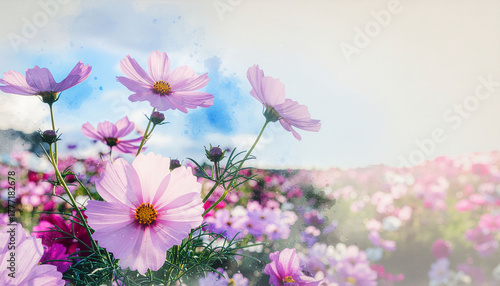 Fototapeta premium Watercolor-inspired floral blur, pastel pink and blue blend, soft and peaceful composition.
