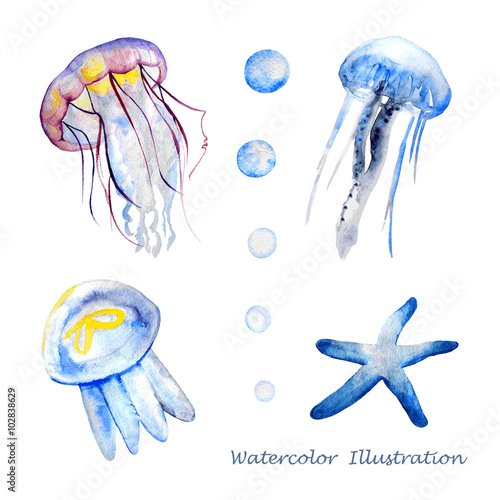 © lenaalyonushka, Obraz premium Watercolor jellyfish illustration.