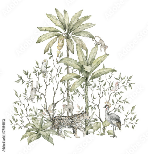 © Kate K., Obraz premium Watercolor Jungle animals and nature elements. Palm trees, panther, crane, parrot, monkey, tropical illustratiion in Chinoiserie style