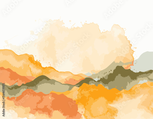 © Alabady, Obraz premium Watercolor Landscape in Warm Earth Tones with Abstract Mountains