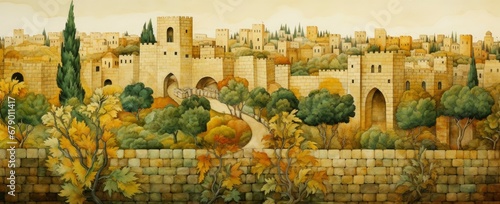 © MdBaki, Fototapeta premium Watercolor Landscape of the Jerusalem Wall with Soft Yellow and Emerald Tones.
