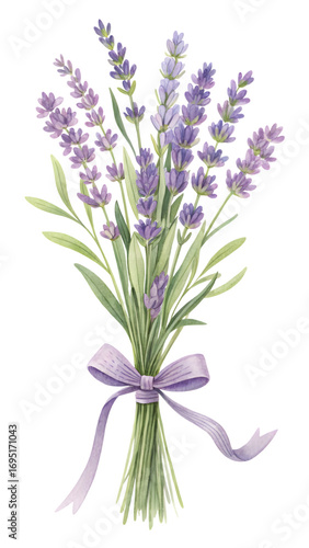 © Tatimurmurprint, Fototapeta premium Watercolor lavender bouquet tied with purple ribbon isolated on black background botanical depiction