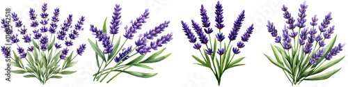 © Nitchalee N., Fototapeta premium Watercolor lavender design and botanical minimalist, A collection of vibrant lavender flowers, showcasing delicate purple blooms and lush green leaves arranged in an appealing composition.