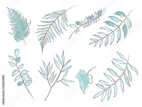 Fototapeta premium Watercolor leaf set. Different leaves and branches in green and blue palette