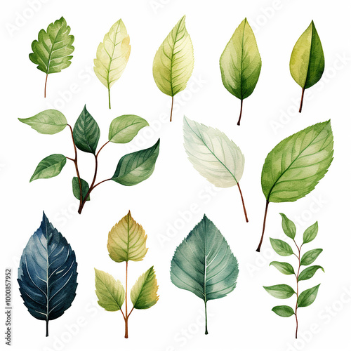 © Arifur Rahman Uzzal, Obraz premium Watercolor Leaves Clipart Set on White Background