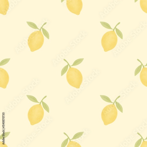 © Seamless Patterns, Obraz premium Watercolor lemon seamless pattern with green leaves on pale yellow background