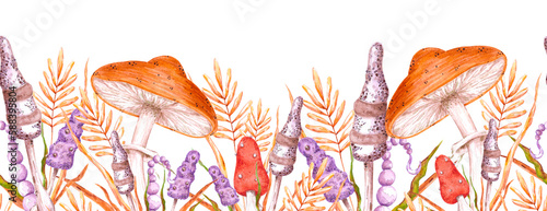 Naklejka premium Watercolor magical mushrooms composition seamless boarder. Isolated on white...