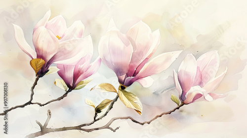 © Pixel, Fototapeta premium Watercolor magnolias using lifting, gentle and soft pastels creating delicate effects, light background