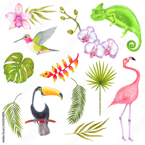 Naklejka premium Watercolor marker tropical set of bird, chameleon, flowers and leaves. Toucan flamingo colibri birds, orchid flowers, banana flowers, philodendron, areca palm, fern frond, bamboo leaves.