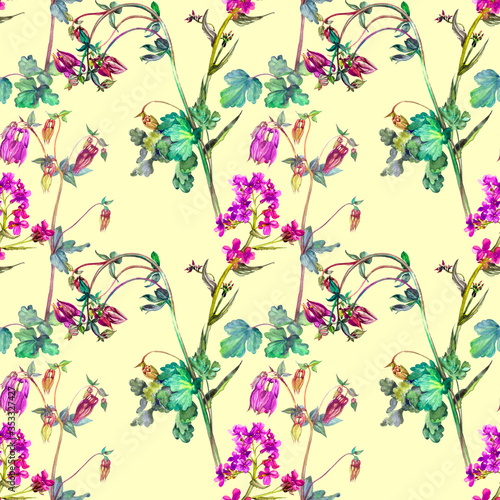 Obraz premium Watercolor meadow flowers, columbine and hesperis of violet coloring. Summer seamless pattern. Design of fabric, wallpaper, background, textile, packaging, wrapping paper, covers.