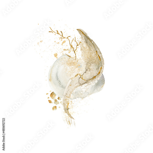 Naklejka premium Watercolor minimalist abstract art. Hand painted composition, gold shape, geometric form, splash, spot. isolated on white background. Waves illustration for design, print logo