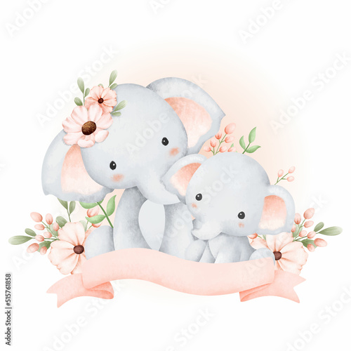 Obraz premium Watercolor mom and baby elephant with flowers and ribbon