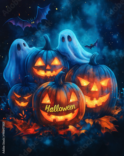 Fototapeta premium Watercolor Neon colored Illustration Artwork Creative Pumpkin Halloween...