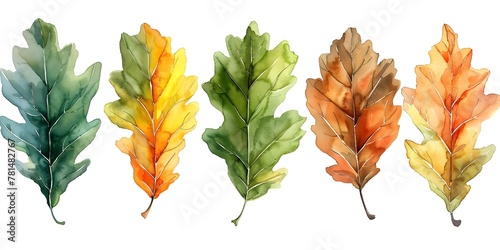 Fototapeta premium Watercolor Oak Leaves Transitioning Through the Seasons on White Background