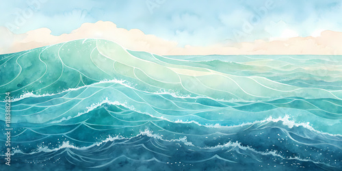 © ZhumaStudio, Fototapeta premium Watercolor ocean breeze banner for coastal theme design and decor.