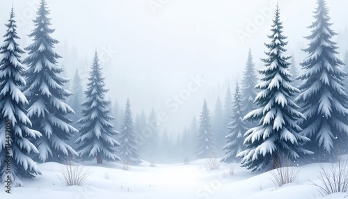 © Eugeny, Fototapeta premium Watercolor of a Snowfall in a Winter Forest with Tall Fir Trees Covered in White Caps