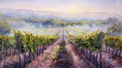 Naklejka premium Watercolor of rows of grapevines stretching into the mist, the sun rising in soft pastels, creating a serene vineyard landscape