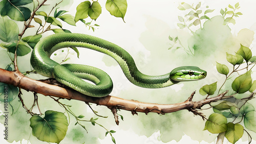 Fototapeta premium Watercolor Oriental poster of green snake. New Year 2025 symbol