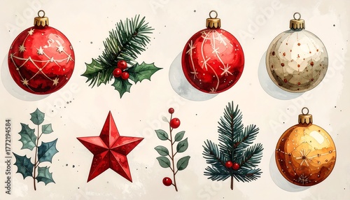 Fototapeta premium Watercolor ornaments, star, and foliage arrangement on a neutral background