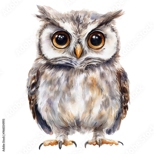 © peerasak, Fototapeta premium Watercolor Owl with Big Eyes - Wildlife Art Print.