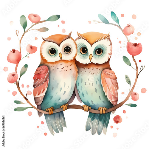 © pisan, Fototapeta premium Watercolor Owls Sitting On Branch Valentine Clipart Illustration
