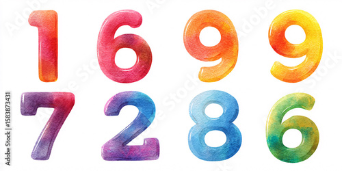 © Dinali, Fototapeta premium Watercolor painted numbers set from zero to nine in vibrant colors for educational resources and creative design projects