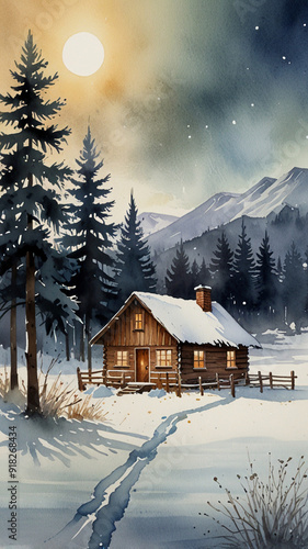 © Jessada, Fototapeta premium Watercolor Painting: Chilly and Cozy minimalist painting capturing the essence of a frosty winter scene. Celebrate the warm and comforting ambiance with a portrayal of a snowy landscape