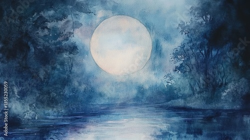 © Chotijah, Fototapeta premium Watercolor painting depicts a moonlit forest scene over a river