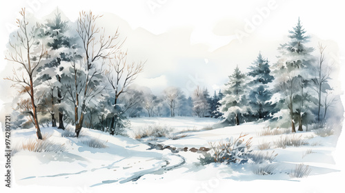 © Pakhnyushchyy, Fototapeta premium Watercolor painting empty panoramic winter background with copy space