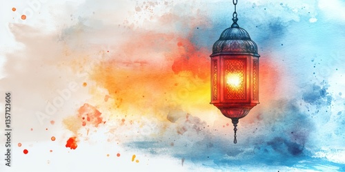 © Nirwasita, Obraz premium Watercolor painting featuring a brightly lit ornamental ramadan lantern