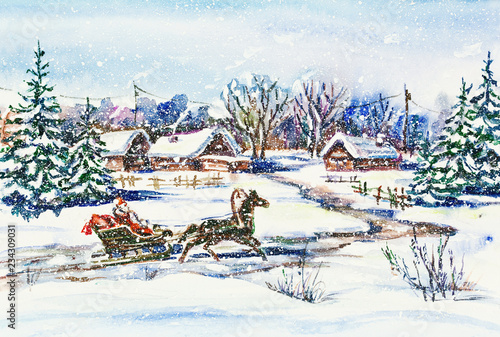 Obraz premium Watercolor painting: New Year winter willage landscape with Santa