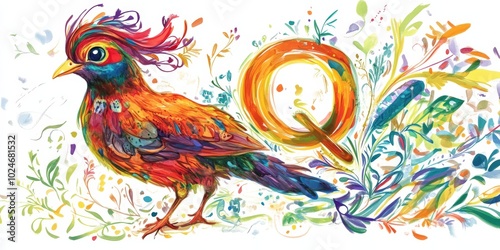 Naklejka premium Watercolor painting of a bird and a letter Q.