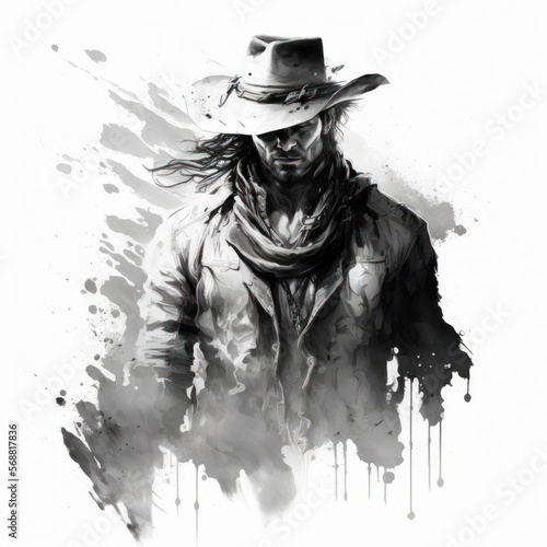 © Fabio, Fototapeta premium Watercolor Painting of a Cowboy - Black and White - Postproducted generative AI digital illustration