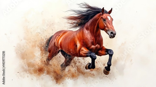 © Igor, Fototapeta premium Watercolor painting of a galloping horse, its mane merging with a stormy sky on an absolutely white background.