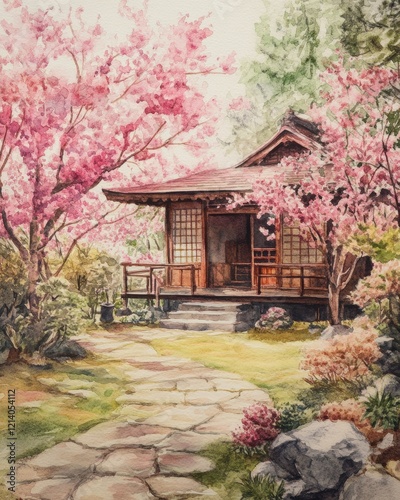 Naklejka premium Watercolor Painting of a Japanese Tea House Surrounded by Cherry Blossoms in...