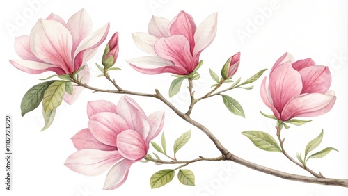 Fototapeta premium Watercolor Painting of a Magnolia Branch with Pink Flowers, Watercolor,...