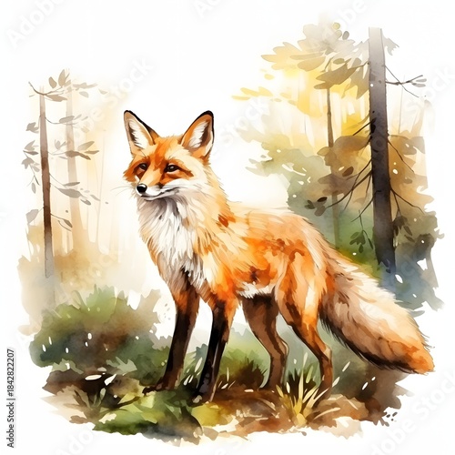 Obraz premium Watercolor painting of a red fox standing in a misty forest