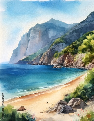 © Giuseppe Cammino, Fototapeta premium Watercolor Painting of a Secluded Beach with Mountains and Sea