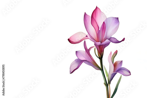 © unairakstudio, Fototapeta premium Watercolor painting of a single pink and purple flower with soft petals blooming on a white background.