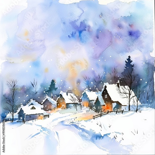 © kiyut, Naklejka premium Watercolor painting of a snowy village at dusk, on isolated white background
