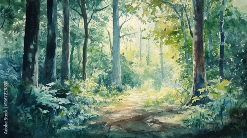 Obraz premium Watercolor painting of a sunlit forest path