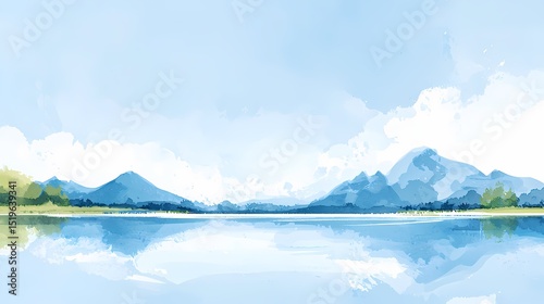 Naklejka premium Watercolor painting of a tranquil lake reflecting mountains under a bright sky. Peaceful nature scene, ideal for relaxation and travel themes.