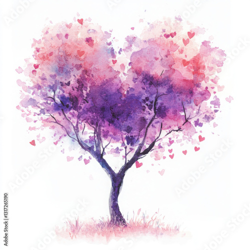 Fototapeta premium Watercolor painting of a tree with heart-shaped leaves in shades of pink and purple, evoking a sense of love and tranquility.