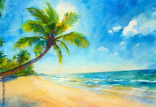 Fototapeta premium Watercolor painting of a tropical beach with palm tree