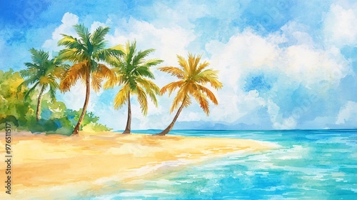 Obraz premium Watercolor painting of a tropical beach with palm trees.