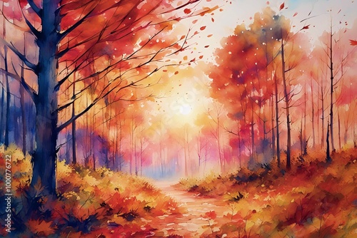 Naklejka premium Watercolor painting of an autumn wood at sunset