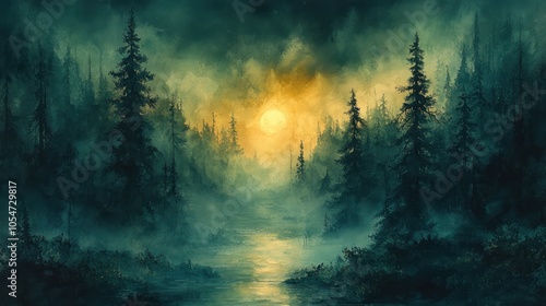 Fototapeta premium Watercolor painting of an enchanted forest with mystical lighting and...