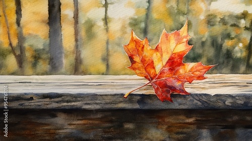 © irasutolive, Obraz premium Watercolor painting of an orange maple leaf on a wooden surface against an autumn forest background.